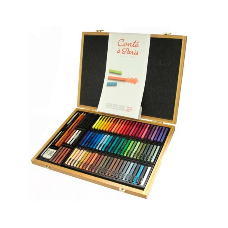 70 carrés de color, 14 carrés de dibujo, 3 lápices, 1 goma, 1 difumino y 1 esfumino.